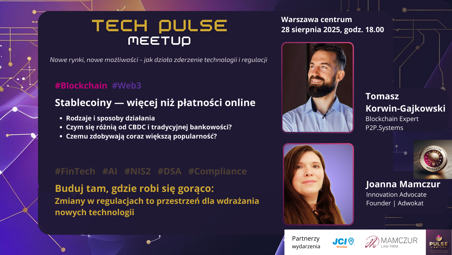 Zapraszamy na meetup dla liderów technologii, innowatorów i osób śledzących, jak firmy technologiczne mogą odpowiadać swoją ofertą na zmiany regulacyjne w świecie cyfrowym. Porozmawiamy też o tym, jak nowe technologie takie jak m.in. stablecoiny napędzają zmiany w procesach wewnętrznych firm, compliance i regulacjach. Spotkanie będzie okazją do wymiany wiedzy, networkingu i rozmów o tym, co naprawdę napędza transformację w sektorze FinTech, AI i Web3.